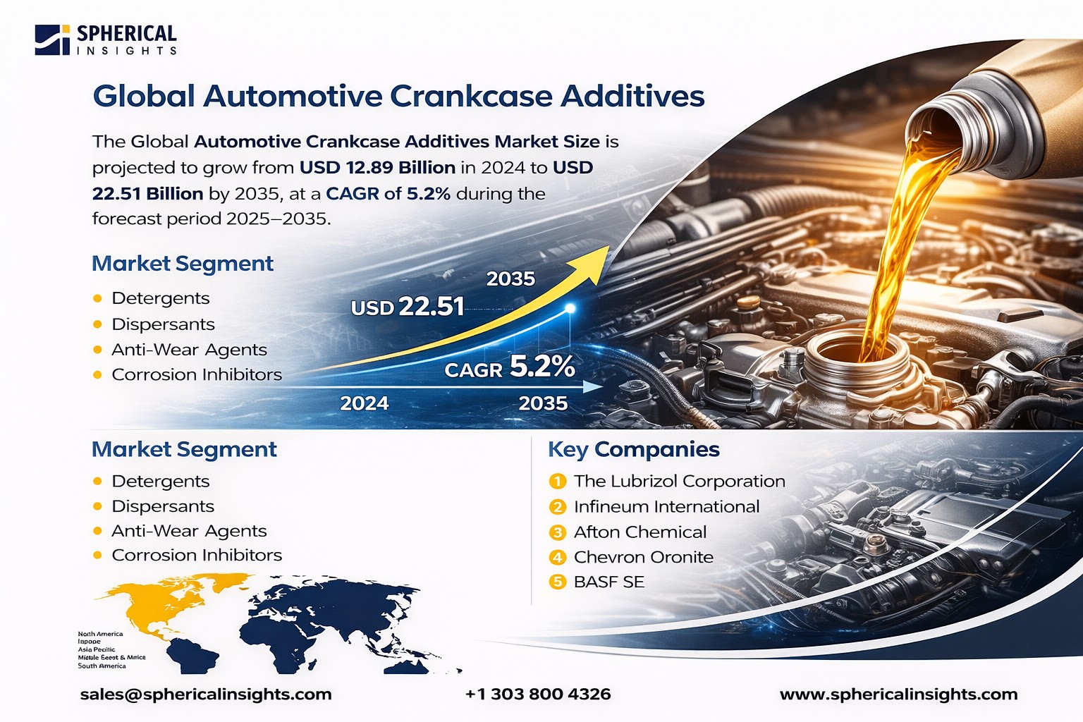 According to a research report published by Spherical Insights & Consulting, the Global Automotive Crankcase Additives Market Size is projected to grow from USD 12.89 Billion in 2024 to USD 22.51 Billion by 2035, at a CAGR of 5.2% during the forecast period 2025–2035. Global market expansion is fuelled by strict environmental regulations demanding high-performance lubricants and the continuous expansion of the worldwide automotive manufacturing industry.