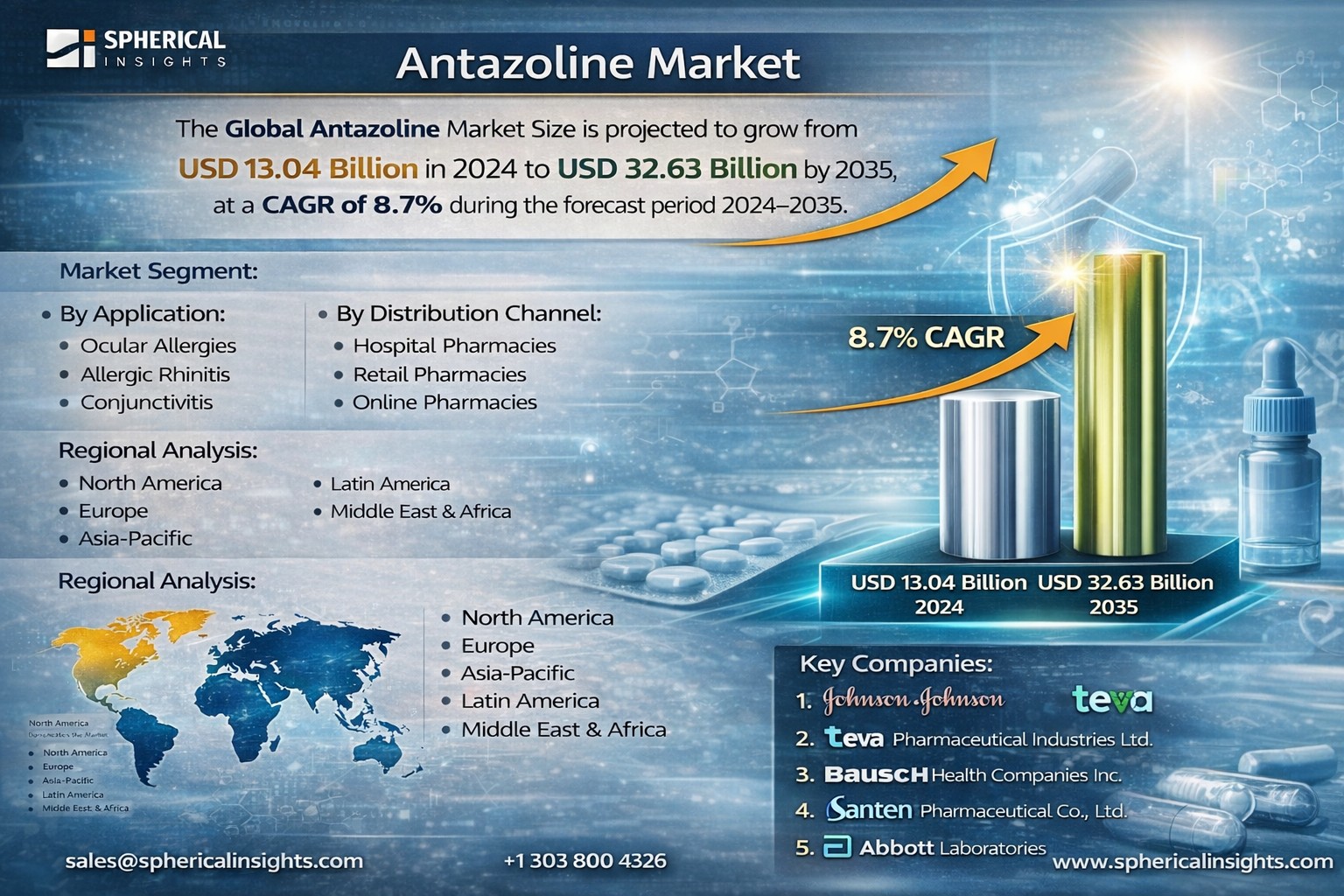 According to a research report published by Spherical Insights & Consulting, the Global Antazoline Market Size is projected to grow from USD 13.04 Billion in 2024 to USD 32.63 Billion by 2035, at a CAGR of 8.7% during the forecast period 2024–2035. The global antazoline market is primarily driven by the increasing prevalence of allergic diseases, such as allergic conjunctivitis and rhinitis, which affect a significant portion of the global population. The market is also propelled by the growing demand for fast-acting, non-systemic antihistamine treatments that can be delivered via ophthalmic solutions (eye drops) and nasal sprays.