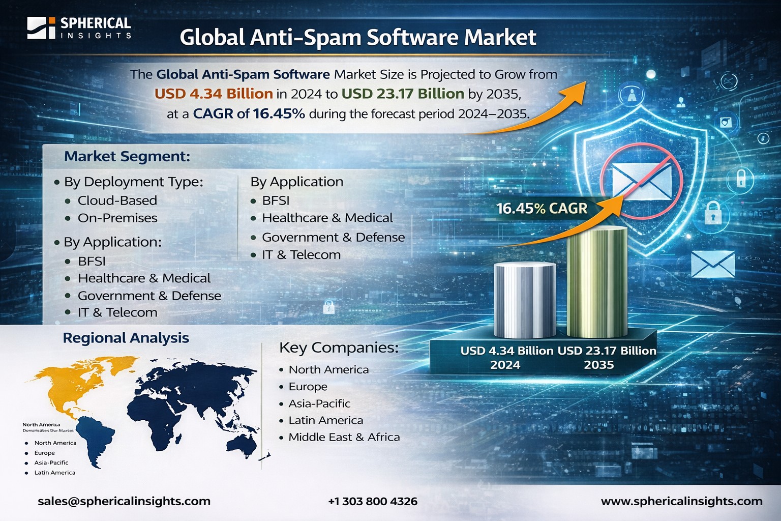 According to a research report published by Spherical Insights & Consulting, the Global Anti-Spam Software Market Size is projected to grow from USD 4.34 Billion in 2024 to USD 23.17 Billion by 2035, at a CAGR of 16.45% during the forecast period 2024–2035. The global anti-spam software market is primarily driven by the surging volume of sophisticated phishing attacks, rising data theft, and the need for cloud-based security solutions. Increased reliance on email communication and the shift toward remote work have heightened vulnerabilities, while the adoption of AI-powered detection and strict regulatory compliance requirements further fuel market growth.