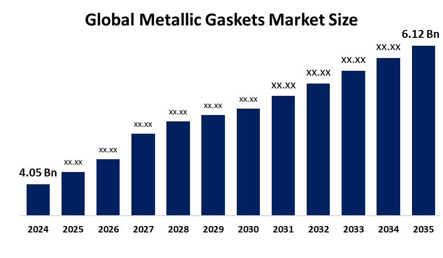 Global Metallic Gaskets Market Size, Share, and, By Product Type (Ring Type Joint Gaskets, Spiral Wound Gaskets, Corrugated Metal Gaskets, and Others), By Application (Heat Exchangers, Boilers, Pressure Vessels, and Others), By End-Use Industry (Oil & Gas, Power Generation, Chemical Processing, Automotive, and Others), By Region (North America, Europe, Asia-Pacific, Latin America, and Middle East & Africa), Analysis and Forecast 2024 – 2035.