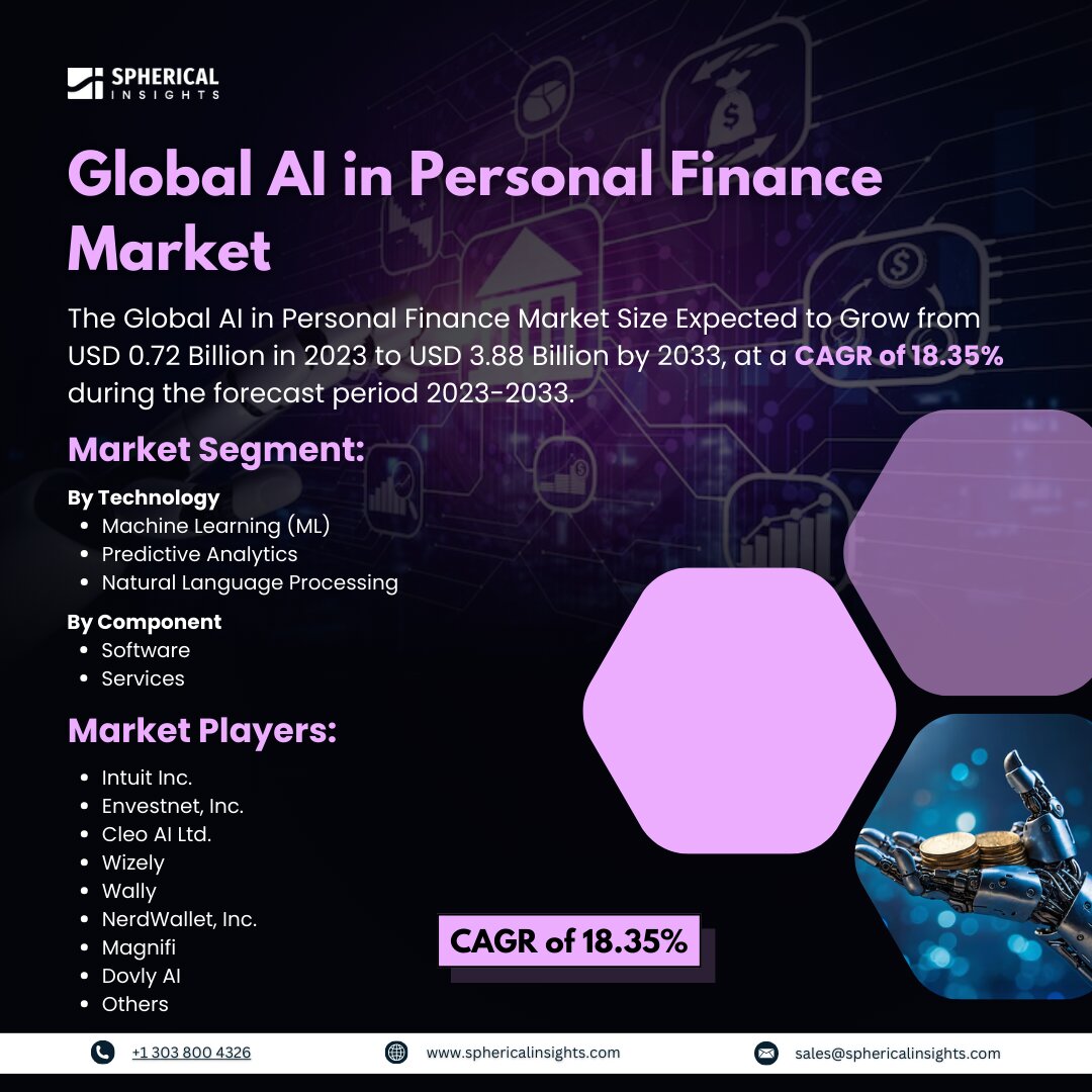 According to a research report published by Spherical Insights & Consulting, the Global AI in Personal Finance Market Size Expected to Grow from USD 0.72 Billion in 2023 to USD 3.88 Billion by 2033, at a CAGR of 18.35% during the forecast period 2023-2033.