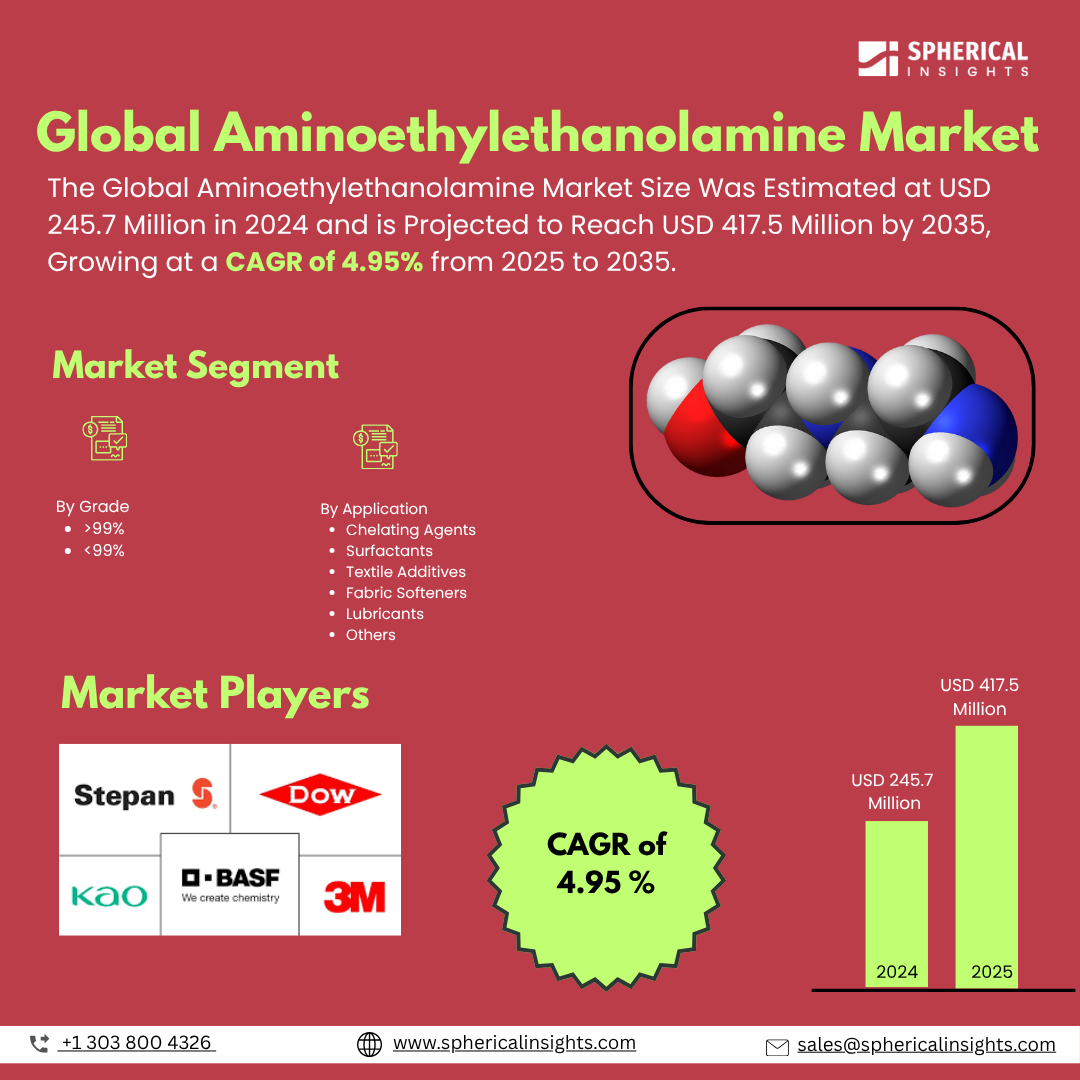 The Global Aminoethylethanolamine Market Size Was Estimated at USD 245.7 Million in 2024 and is Projected to Reach USD 417.5 Million by 2035, Growing at a CAGR of 4.95% from 2025 to 2035. The market for aminoethylethanolamine (AEEA) is expanding because of a factors, such as its adaptability to a wide range of applications, rising consumer demand for environmentally friendly goods, and growth in important end-use industries.