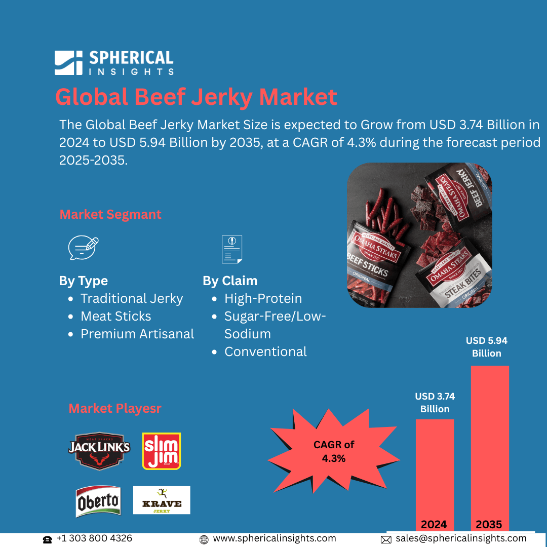 According to Decision Advisor, The Global Beef Jerky Market Size is expected to Grow from USD 3.74 Billion in 2024 to USD 5.94 Billion by 2035, at a CAGR of 4.3% during the forecast period 2025-2035. The growing consumer shift toward high-protein, convenient, and low-sugar snacks is driving demand for beef jerky globally. Increasing health awareness, busy lifestyles, and the rising popularity of on-the-go protein snacks are key factors fueling market expansion.