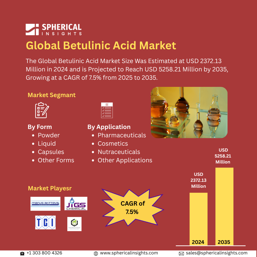 The Global Betulinic Acid Market Size Was Estimated at USD 2372.13 Million in 2024 and is Projected to Reach USD 5258.21 Million by 2035, Growing at a CAGR of 7.5% from 2025 to 2035. The market for betulinic acid is expanding because of its growing use in cosmetics and pharmaceuticals, the growing demand for natural bioactive compounds, the growing research into anti-inflammatory and anti-cancer treatments, and the growing consumer preference for safe, sustainable ingredients derived from plants.