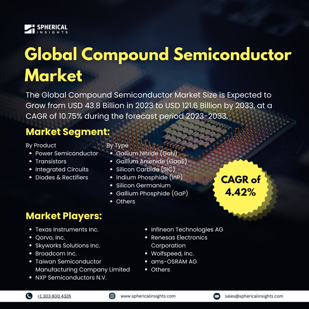 According to a research report published by Spherical Insights & Consulting, the Global Compound Semiconductor Market Size is Expected to Grow from USD 43.8 Billion in 2023 to USD 121.6 Billion by 2033, at a CAGR of 10.75% during the forecast period 2023-2033.