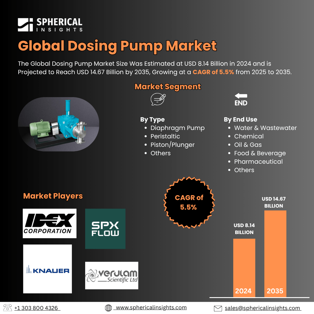 The Global Dosing Pump Market Size Was Estimated at USD 8.14 Billion in 2024 and is Projected to Reach USD 14.67 Billion by 2035, Growing at a CAGR of 5.5% from 2025 to 2035. The need for accurate chemical dosing, increased industrial automation, stricter environmental regulations, the need for water treatment, chemical processing, and pharmaceuticals, as well as improvements in pump technologies that increase efficiency and dependability, are all driving growth in the dosing pump market.