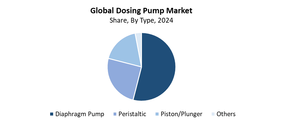 The diaphragm pump segment leads the global dosing pump market with the largest revenue share of 54.2% in 2024. Diaphragm pumps operate with high precision and reliability to handle viscous and corrosive fluids, which makes them the best choice for chemical dosing, water treatment, and pharmaceutical applications. The equipment operates without leaks because of its durable construction. This helps reduce maintenance costs and operational downtime. Diaphragm pumps maintain their position as top sellers because industrial automation continues to grow, and water treatment and process industries need exact chemical dosing. The dosing pump industry gains market dominance through its ability to operate in multiple sectors, which digital control systems and material advancements continue to strengthen for long-term market expansion.