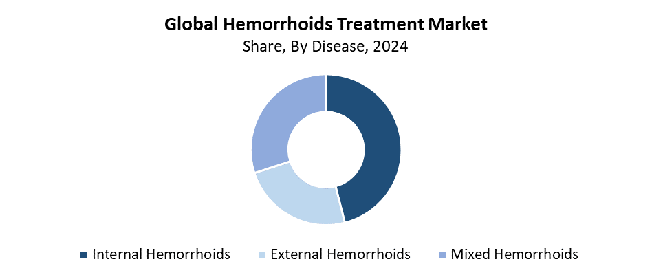 - In 2024, the internal hemorrhoids segment held the highest revenue share of 46.75% and dominated the global market by disease.