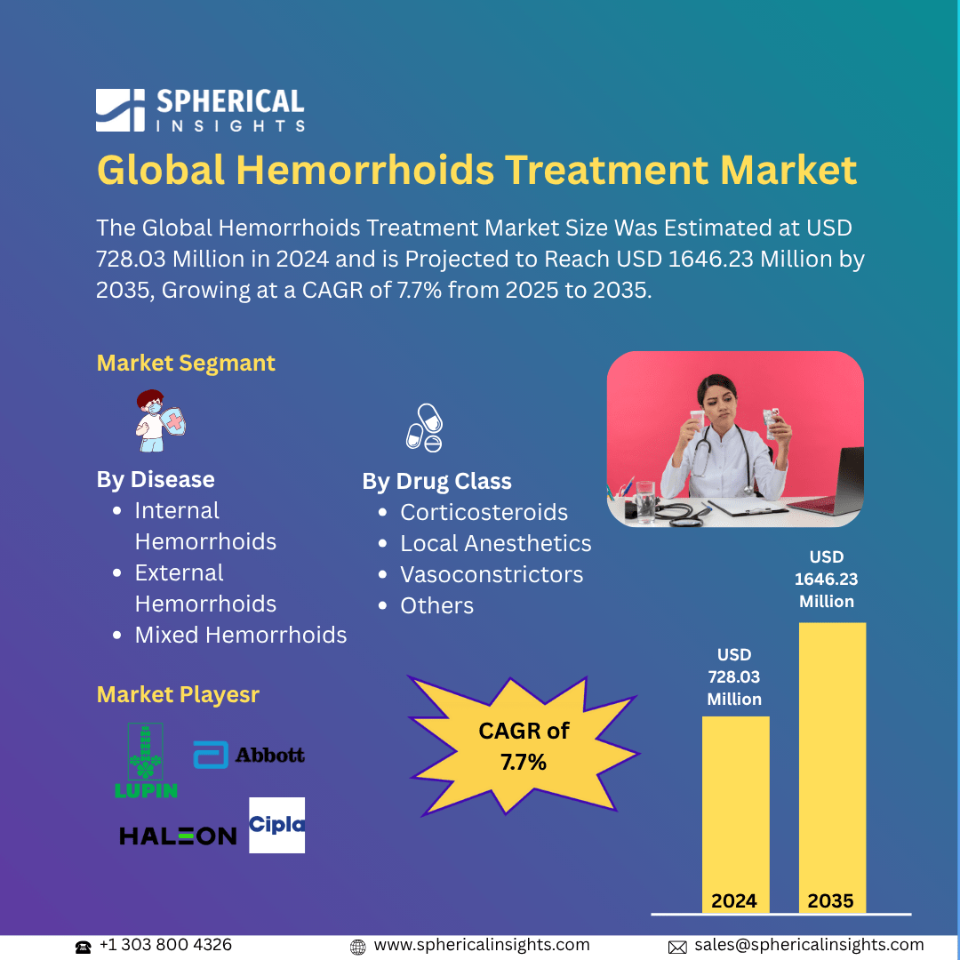 The Global Hemorrhoids Treatment Market Size Was Estimated at USD 728.03 Million in 2024 and is Projected to Reach USD 1646.23 Million by 2035, Growing at a CAGR of 7.7% from 2025 to 2035. The market for hemorrhoids treatment is growing due to several factors, including the increasing incidence of hemorrhoidal disorders, sedentary lifestyles, poor diets, increased awareness of minimally invasive procedures, improvements in treatment technologies, and increased access to healthcare and over-the-counter drugs worldwide.