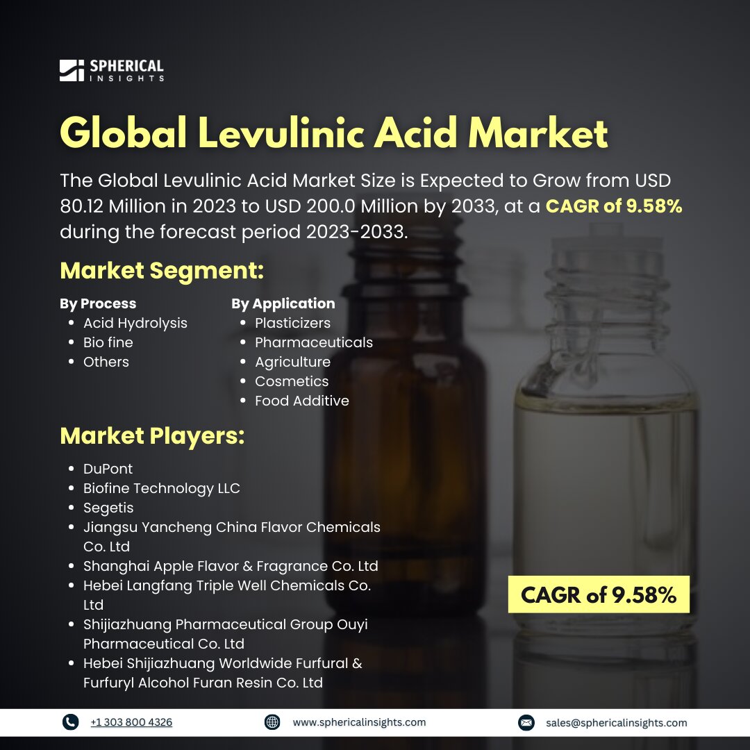 According to a research report published by Spherical Insights & Consulting, the Global Levulinic Acid Market Size is Expected to Grow from USD 80.12 Million in 2023 to USD 200.0 Million by 2033, at a CAGR of 9.58% during the forecast period 2023-2033.
