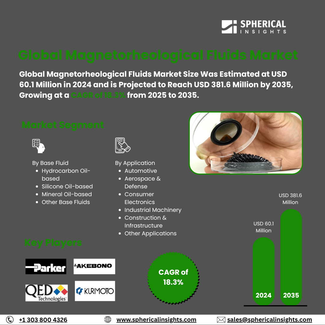 The Global Magnetorheological Fluids Market Size Was Estimated at USD 60.1 Million in 2024 and is Projected to Reach USD 381.6 Million by 2035, Growing at a CAGR of 18.3% from 2025 to 2035. The market for magnetorheological fluids is expanding because of the growing need for fluid-based solutions that are effective, controllable, and energy-efficient; the growing demand for adaptive damping systems in the automotive and aerospace industries; and the growing adoption of robotics and industrial machinery.