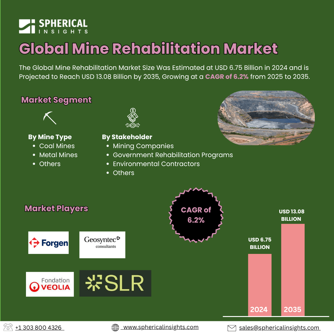 The Global Mine Rehabilitation Market Size Was Estimated at USD 6.75 Billion in 2024 and is Projected to Reach USD 13.08 Billion by 2035, Growing at a CAGR of 6.2% from 2025 to 2035. The market for mine rehabilitation is expanding as a result of increased mining activity, more stringent environmental regulations, government incentives, technological developments in land restoration, corporate social responsibility programs, and the global movement toward resource conservation and environmental protection.