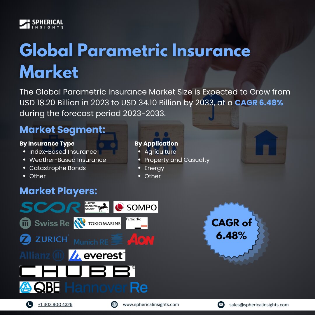According to a research report published by Spherical Insights & Consulting, the Global Parametric Insurance Market Size is Expected to Grow from USD 18.20 Billion in 2023 to USD 34.10 Billion by 2033, at a CAGR 6.48% during the forecast period 2023-2033.