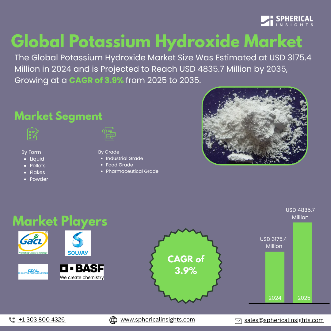 The Global Potassium Hydroxide Market Size Was Estimated at USD 3175.4 Million in 2024 and is Projected to Reach USD 4835.7 Million by 2035, Growing at a CAGR of 3.9% from 2025 to 2035. The market for potassium hydroxide is expanding due to growing demand in personal care products, alkaline batteries, agriculture, chemical manufacturing, and more environmentally friendly applications, all of which are facilitated by innovation and industrial growth.