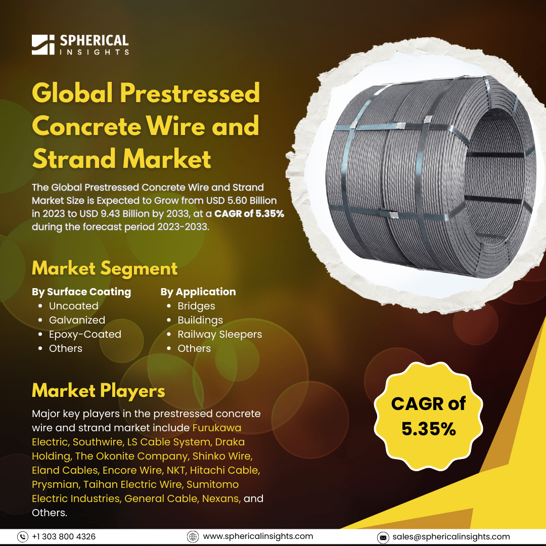 According to a research report published by Spherical Insights & Consulting, The Global Prestressed Concrete Wire and Strand Market Size is Expected to Grow from USD 5.60 Billion in 2023 to USD 9.43 Billion by 2033, at a CAGR of 5.35% during the forecast period 2023-2033.