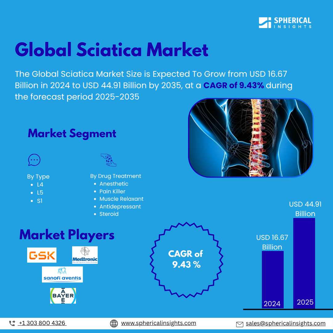 - As per Spherical Insights & Consulting, The Global Sciatica Market Size is Expected To Grow from USD 16.67 Billion in 2024 to USD 44.91 Billion by 2035, at a CAGR of 9.43% during the forecast period 2025-2035, owing to the launch of new therapies in the market and the rise in the number of cases.
