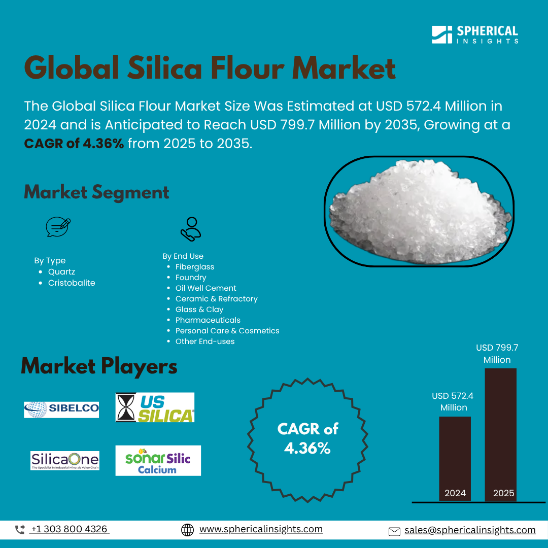 The Global Silica Flour Market Size Was Estimated at USD 572.4 Million in 2024 and is Anticipated to Reach USD 799.7 Million by 2035, Growing at a CAGR of 4.36% from 2025 to 2035. The growing oil and gas industry, growing building activity, and rising demand in the foundry and glass manufacturing sectors are some of the major reasons driving the silica flour market's expansion.