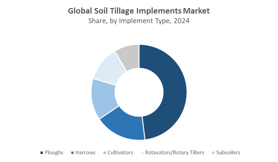 The soil tillage implements market is propelled by the growing trend of mechanized farming, driven by the need to improve efficiency and maximize crop yields. Expansion of commercial agriculture globally, especially in regions with large arable land, is increasing demand for ploughs, harrows, cultivators, rotavators, and subsoilers. Government programs offering subsidies and incentives for modern farming equipment further accelerate adoption. Advanced implements, such as self-propelled rotavators, mini-tillers, and tractor-mounted tools, reduce labor dependency, improve soil aeration, minimize compaction, and enhance productivity, making mechanisation increasingly essential for sustainable and efficient farming.