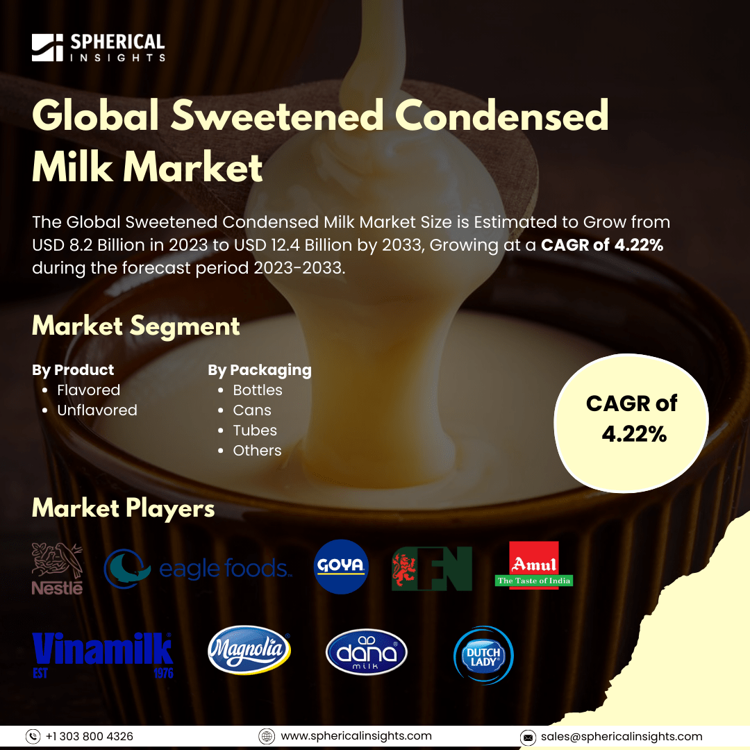 According to a research report published by Spherical Insights & Consulting, The Global Sweetened Condensed Milk Market Size is Estimated to Grow from USD 8.2 Billion in 2023 to USD 12.4 Billion by 2033, Growing at a CAGR of 4.22% during the forecast period 2023-2033.