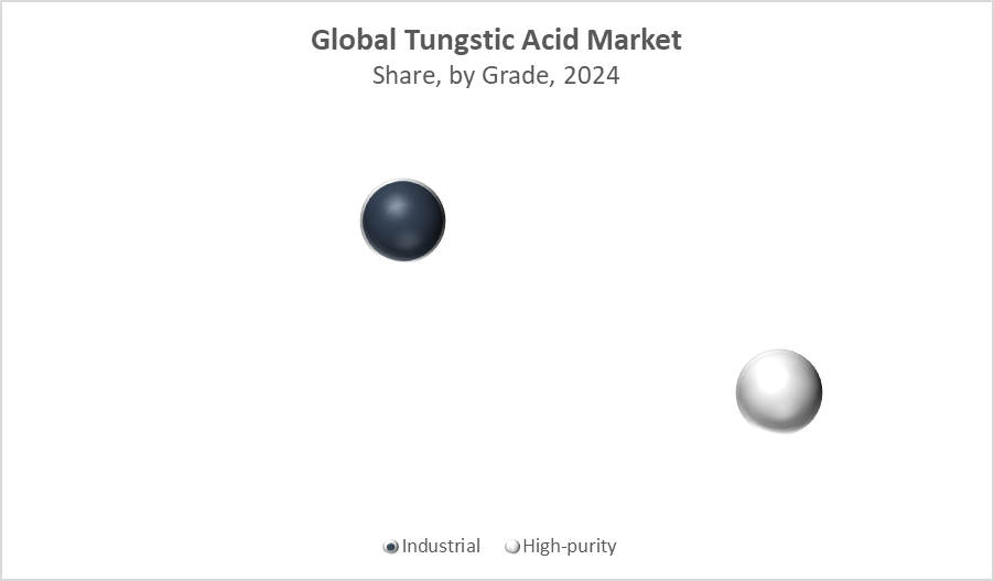The industrial grade segment dominates the tungstic acid market in terms of revenue during the forecast period. Its widespread adoption is driven by usage in general catalysts for chemical processes and pigment production in industries like automotive coatings, ceramics, and textiles. Industrial-grade tungstic acid offers sufficient purity for these applications at a lower cost, making it the preferred choice for large-scale industrial operations. Its high availability and cost-effectiveness contribute to its dominant position.