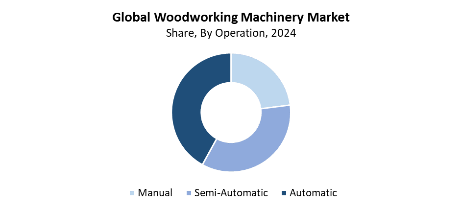 The automatic segment dominated the global woodworking machinery market by holding the largest revenue share of 42.8% in 2024. The woodworking industry maintains its market position because it delivers precise and efficient woodworking processes to meet the needs of cabinetry, building, and furniture manufacturing. The production of large-scale and customised wood products becomes more efficient through automatic machines because they boost manufacturing speed while minimising mistakes and cutting down on human work. The market experiences growth because automated control systems, robotics, and CNC technology become more prevalent in industrial applications. The woodworking machinery market proves the automatic segment's leading position because manufacturers deploy automated solutions to achieve safe operations and energy efficiency while overcoming rising labour expenses.