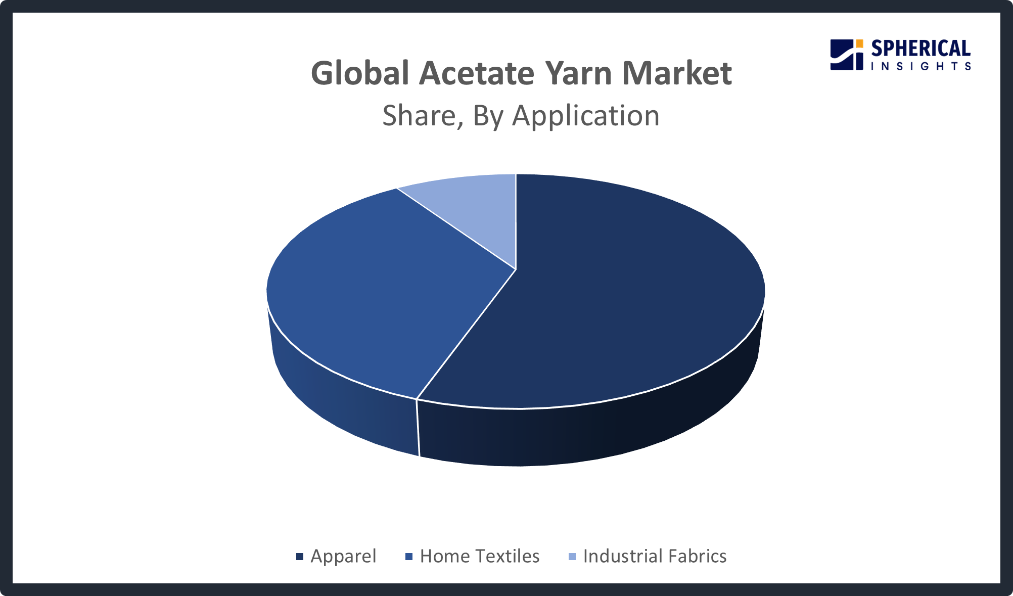 Based on the type, the acetate yarn market is divided into filament yarn and staple yarn. Among these, the filament yarn segment dominated the market in 2024 and is projected to grow at a substantial CAGR during the forecast period. Its exceptional strength, homogeneity, and smooth texture make it perfect for luxury fabrics, linings, and high-end textiles. It has outstanding drape, gloss, and longevity thanks to its continuous filament structure. Digital textile printing and spinning technology advancements increase their adaptability and creative possibilities, fostering widespread usage. The foreseeable period is expected to see this segment develop at a significant CAGR.