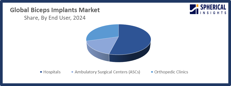 Based on the end user, the biceps implants market is divided into hospitals, ambulatory surgical centers (ASCs), and orthopedic Clinics. Among these, the hospitals segment accounted for the largest share in 2024 and is anticipated to grow at a remarkable CAGR during the forecast period. Complex biceps implant procedures, which frequently call for interdisciplinary coordination and post-operative care, are primarily performed in hospitals.