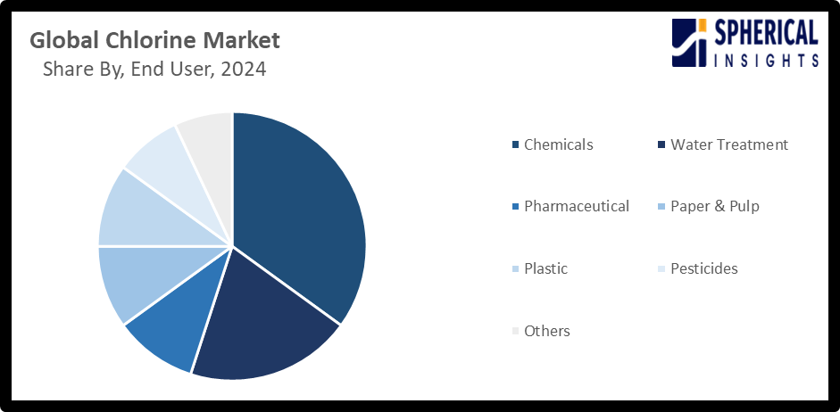 Based on the end user, the global chlorine market is divided into water treatment, pharmaceutical, chemicals, paper and pulp, plastic, pesticides, and others. Among these, the chemicals segment dominated the market with the largest share of about 35.0% in 2024 and is projected to grow at a substantial CAGR during the forecast period. This is due to chlorine’s widespread use in producing industrial chemicals, solvents, plastics, and specialty compounds, enabling diverse applications in manufacturing, construction, and processing.
