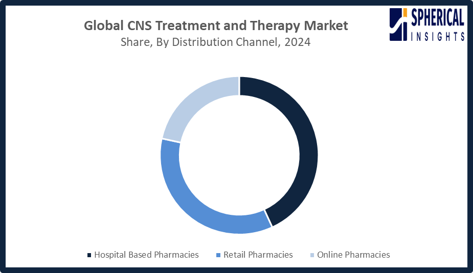 Based on the distribution channel, the CNS treatment and therapy market is divided into hospital based pharmacies, retail pharmacies, and online pharmacies. Among these, the hospital based pharmacies segment accounted for the highest market revenue in 2024 and is anticipated to grow at a significant CAGR during the forecast period. Segment growth is supported by government hospital investments, integrated specialty services, improved inventory and adherence programs, pharmacist-led education, and strict CNS drug regulations driving reliance on compliant hospital-based pharmacy systems.
