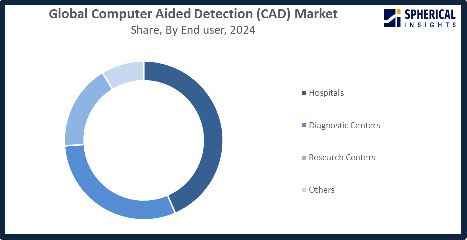 Based on the end user, the computer aided detection market is divided into hospitals, diagnostic centers, research centers, and others. Among these, the hospitals segment accounted for the highest market revenue in 2024 and is anticipated to grow at a significant CAGR during the forecast period. The hospitals segment market growth is due to increased patient volumes necessitating imaging, sophisticated infrastructure for integrating AI-based technologies, and the requirement for high precision diagnostic services for cancer screening to reduce false positives.