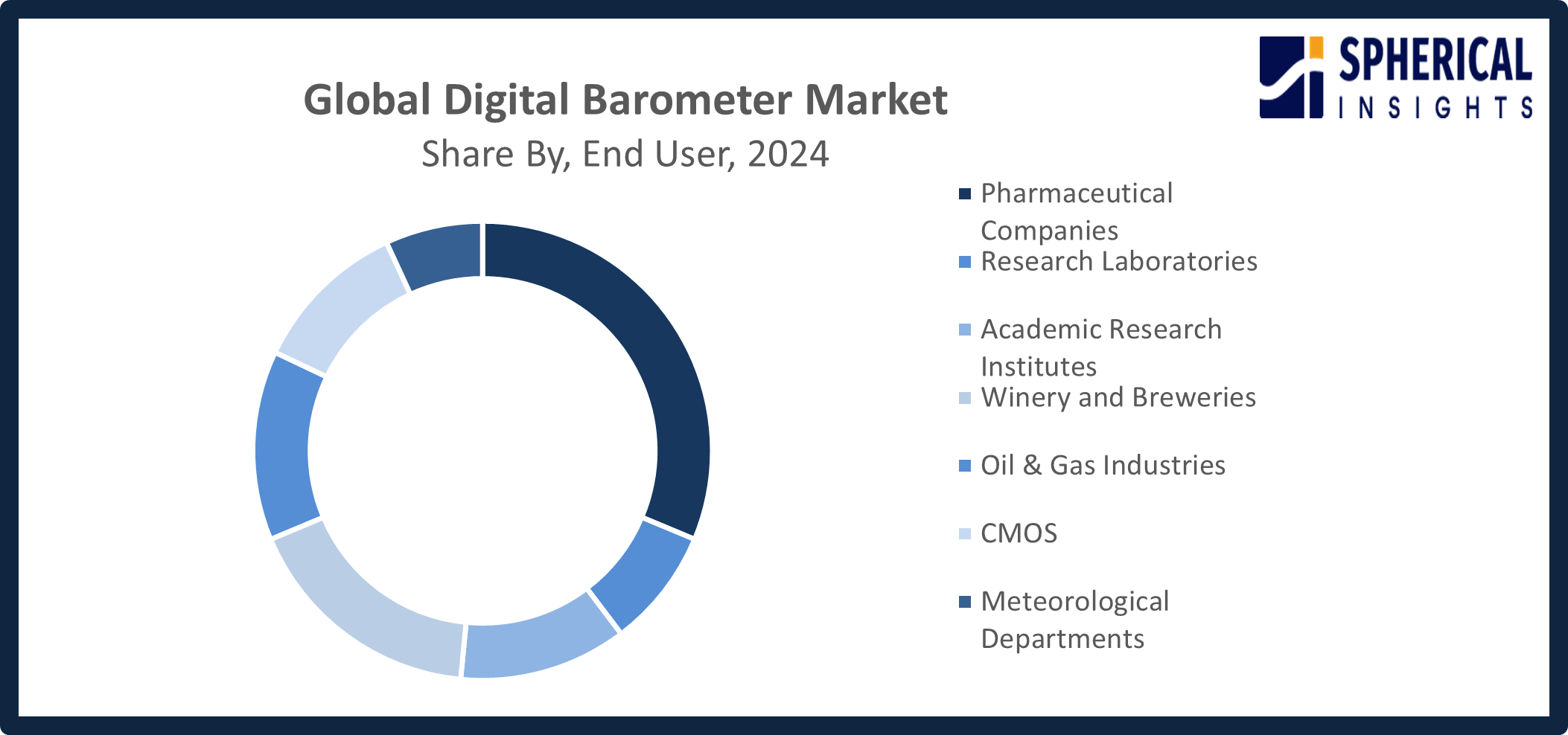 Based on the end user, the digital barometer market is divided into pharmaceutical companies, research laboratories, academic research institutes, winery and breweries, oil & gas industries, CMOS, and meteorological departments. Among these, the pharmaceutical companies segment accounted for the highest market revenue in 2024 and is anticipated to grow at a significant CAGR during the forecast period. The pharmaceutical operations expand and prioritize automation and accurate monitoring, digital barometers have emerged as crucial tools, bolstering this industry.