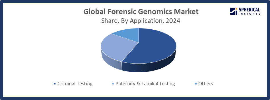 Based on the application, the forensic genomics market is divided into criminal testing, paternity & familial testing, and others. Among these, the criminal testing segment accounted for the largest share in 2024 and is anticipated to grow at a remarkable CAGR during the forecast period. Cutting-edge methods like DNA profiling make it possible to identify people according to their distinct genetic composition, which significantly helps in crime testing.