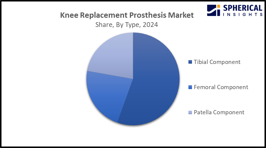 Based on the type, the knee replacement prosthesis market is divided into tibial component, femoral component, and patella component. Among these, the tibial component segment dominated the market in 2024, with about 55.5% share and is projected to grow at a substantial CAGR during the forecast period. The advantages of tibial components, including joint fixation, preventing implant loosening, and improving patients' mobility, are responsible for driving the segmental market growth.