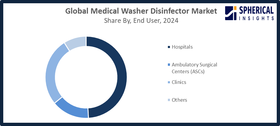 Based on the end user, the medical washer disinfector market is divided into hospitals, ambulatory surgical centers (ASCs), clinics, and others. Among these, the hospitals segment accounted for the highest market revenue in 2024 and is anticipated to grow at a significant CAGR during the forecast period. The need for effective washer-disinfectors is fueled by the increase in hospital-acquired infections (HAIs), which emphasizes the necessity of strict disinfection procedures.