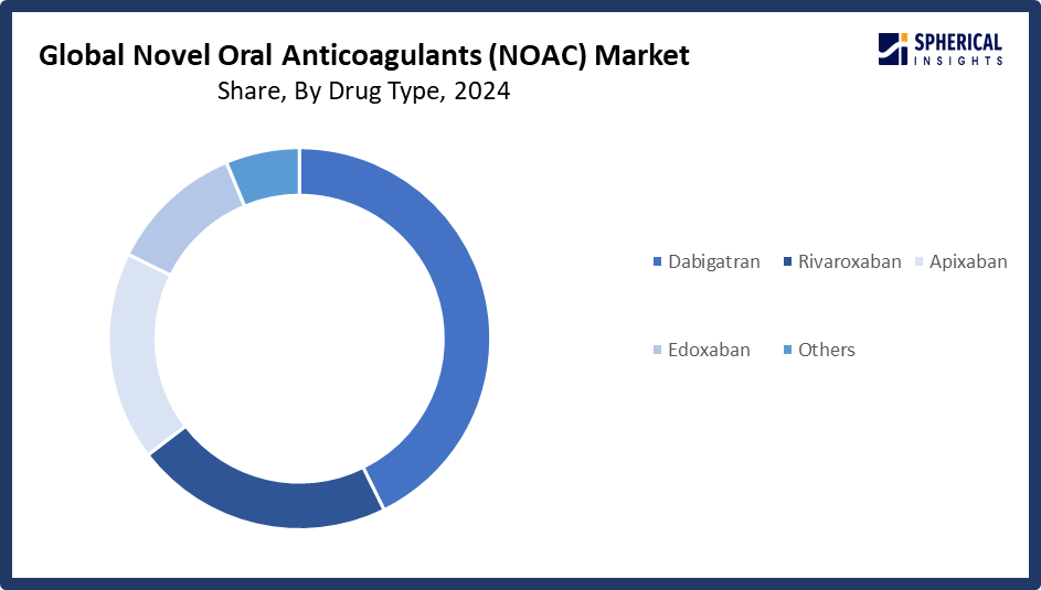 Based on the drug type, The Novel Oral Anticoagulants (NOAC) Market Size is divided into dabigatran, rivaroxaban, apixaban, edoxaban, and others. Among these, the dabigatran segment dominated the market in 2024 and is projected to grow at a substantial CAGR during the forecast period. The segment's development is stimulated by its early entry into the market for direct thrombin inhibitors, its good clinical trial data for preventing stroke in patients with atrial fibrillation and VTE, its availability of reversal medications such as idarucizumab, and its low number of food and drug interactions. Its rise is anticipated to be further driven by the rising incidence of AF, the aging population, and generic entrants.