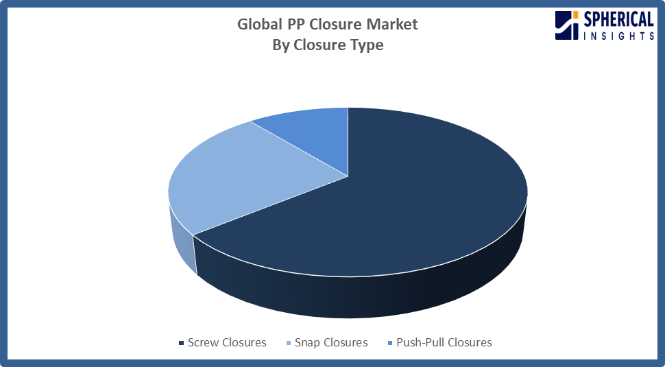 Based on the closure type, the PP closure market is divided into screw closures, snap closures, and push-pull closures. Among these, the screw closures segment accounted for the largest share in 2024 and is anticipated to grow at a significant CAGR during the forecast period. The factors that led to the adoption of this technology in the packaging industry were its ease of use, secure sealing, versatility across different types of packaging, widespread use in beverages and pharmaceuticals, cost-effectiveness, and compatibility with automated bottling and production processes.
