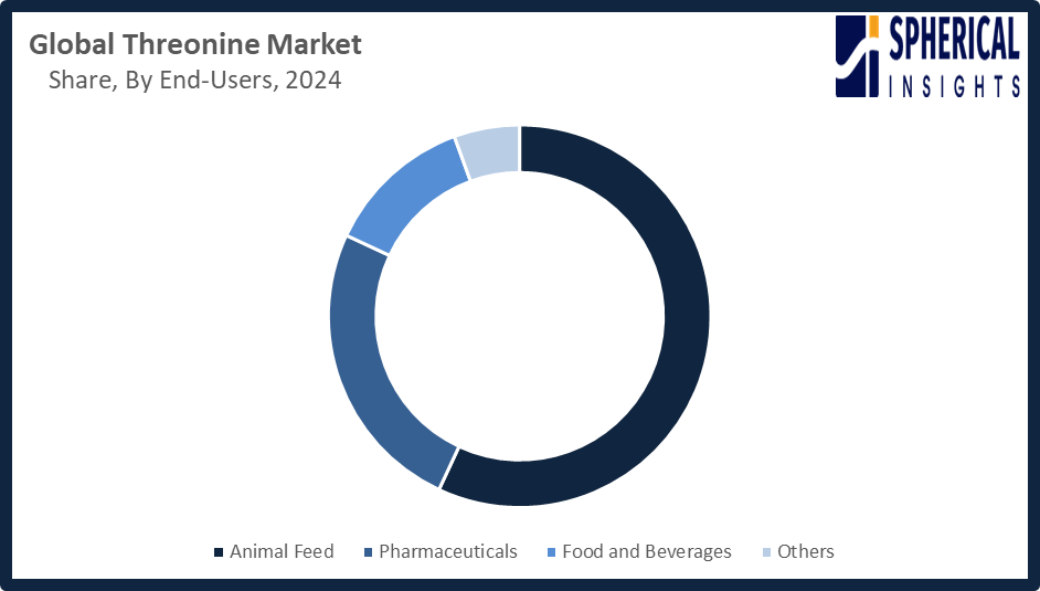 Based on the end-users, the threonine market is divided into animal feed, pharmaceuticals, food and beverages, and others. Among these, the animal feed segment accounted for the highest market revenue in 2024 and is anticipated to grow at a significant CAGR during the forecast period. With growing global demand for animal protein, threonine is increasingly added to feed to improve efficiency, promote growth, and boost productivity. It lowers crude protein requirements, reduces feed costs, and decreases nitrogen excretion, supporting environmental sustainability.