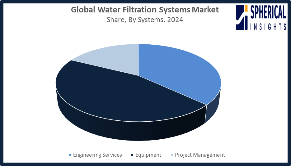 Based on the systems, the water filtration systems market is divided into engineering services, equipment, and project management. Among these, the equipment segment accounted for the largest share in 2024 and is anticipated to grow at a significant CAGR during the forecast period. The rising water contamination concerns, adoption of energy-efficient smart filtration systems, expanding infrastructure projects, and stringent clean water regulations are driving the global installation of advanced, high-performance water filtration equipment across various sectors.