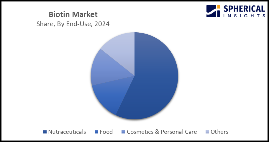 Based on the end-use, the biotin market is divided into nutraceuticals, food, cosmetics & personal care, and others. Among these, the nutraceuticals segment dominated the market with the largest share of about 71.0% in 2024 and is projected to grow at a substantial CAGR during the forecast period. Biotin is used as an essential nutrient in some foods and as a dietary supplement. For instance, Biotrex Nutraceuticals’ Biotin supplements and GDM Nutraceuticals LLP BIOTIN 10,000 mcg+ are commercialized for supporting skin, nails, and hair health. An increasing adoption of biotin nutraceuticals, along with the expanding nutraceutical sector, is propelling the biotin market.
