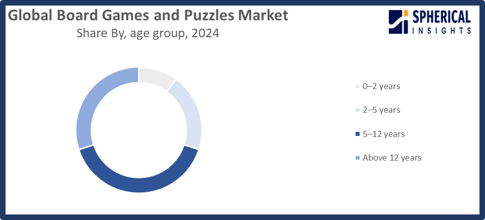 Based on the age group, the global board games and puzzles market is divided into 0-2 years, 2-5 years, 5-12 years, and above 12 years. Among these, the 5-12 years segment dominated the market in 2024, approximately 40%, and is projected to grow at a substantial CAGR during the forecast period. The dominance is driven by strong demand for educational and skill-development games among school-age children, increasing parental focus on cognitive learning, and widespread adoption of puzzles and board games in schools and extracurricular activities.