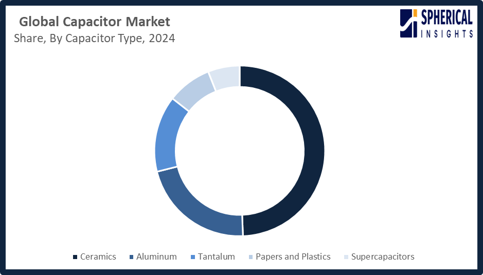 Based on the capacitor type, the capacitor market is divided into ceramics, aluminum, tantalum, papers & plastics, and supercapacitors. Among these, the ceramics segment accounted for the largest share in 2024 and is anticipated to grow at a significant CAGR during the forecast period. This segment is leading, attributed to their extensive applications in consumer electronics, telecommunications, automotive systems, and industrial devices. Ceramic capacitors possess benefits such as small size, high stability, low cost, and superior frequency characteristics, which make them suitable for multilayer applications in smartphones, laptops, and EVs. Moreover, the increasing requirements of multilayer ceramic capacitors (MLCCs) in 5G-enabled devices and electric vehicles further consolidated this segment's position.
