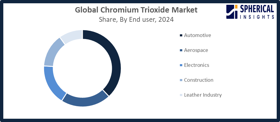 Based on the end user, the chromium trioxide market is divided into automotive, aerospace, electronics, construction, and leather industry. Among these, the automotive segment accounted for the highest market revenue in 2024, approximately 38%, and is anticipated to grow at a significant CAGR during the forecast period. Chromium trioxide is frequently used to improve the hardness, corrosion resistance, and visual attractiveness of automotive components, including engine parts, wheels, bumpers, trims, and ornamental fittings. The demand for chrome-plated parts that provide durability and improved performance is greatly increased by the expanding global production of automotive and trucks.