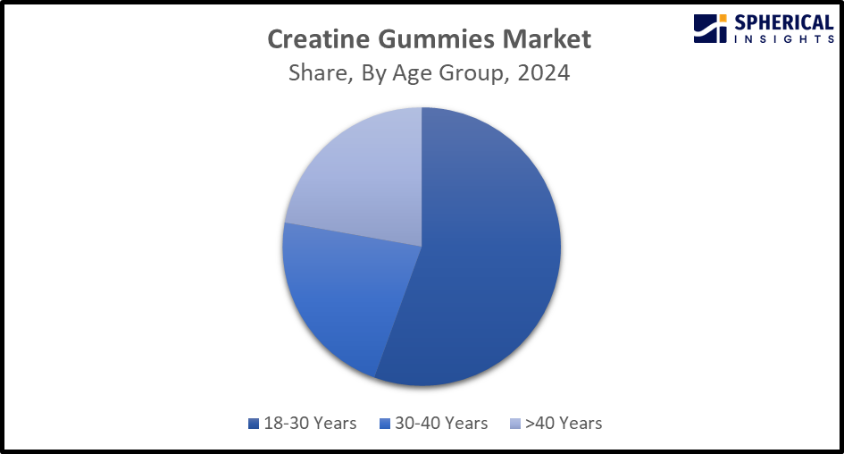 Based on the age group, the creatine gummies market is divided into 18-30 years, 30-40 years, and >40 years. Among these, the 18-30 years segment accounted for the largest market share of around 50.0% in 2024 and is anticipated to grow at a significant CAGR during the projected period. 18-30 is considered the ideal age group for creatine supplementation. According to studies, adults between the ages of 18 and 30 can boost their muscular growth by routinely consuming creatine, lifting weights, and exercising. Further, the influence of social media and fitness culture promoting the use of creatine supplements, highlighting advantage of gummy forms for their taste and ease of usage, is contributing to drive segmental market growth.