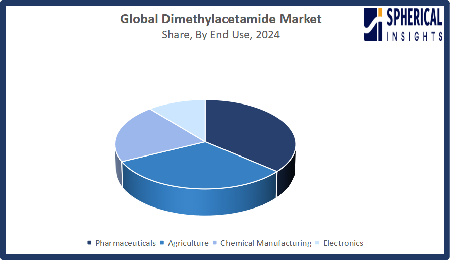 Based on the end use, the Dimethylacetamide Market is divided into pharmaceuticals, agriculture, chemical manufacturing, electronics, and others. Among these, the pharmaceuticals segment accounted for the highest market revenue in 2024 and is anticipated to grow at a significant CAGR during the forecast period. The pharmaceuticals market grows because DMAC serves as an essential solvent for active pharmaceutical ingredient (API) synthesis and drug formulation. The segment accounts for 40-45% of global DMAC demand because chronic diseases lead to 17.9 million annual deaths, and pharmaceutical production is projected to grow 25% within five years. Since 2020, antibiotic production has increased by 30%.