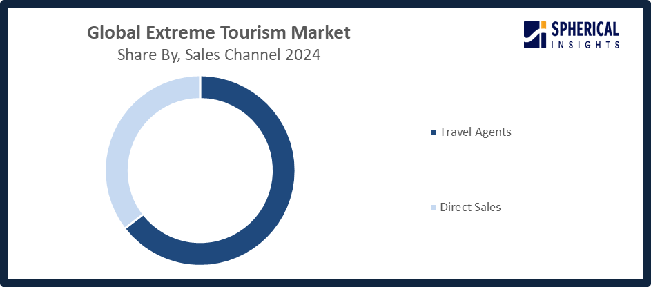 Based on the sales channel, the extreme tourism market is divided into travel agents and direct sales. Among these, the travel agents segment accounted for the highest market revenue in 2024 and is anticipated to grow at a significant CAGR during the forecast period. The capacity to provide personalized adventure packages, professional advice, and thorough logistical support, all of which increase client convenience and trust, drives the travel agent market. Because they can make complicated preparation easier and give confidence to travelers who might otherwise be reluctant to partake in risky activities, travel agencies are encouraging involvement in extreme tourism.
