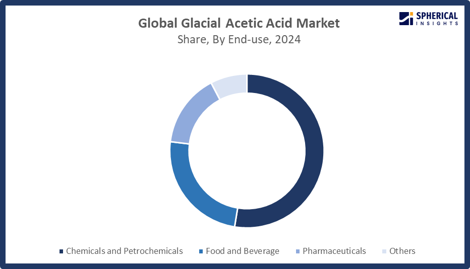 Based on the end-use, the glacial acetic acid market is divided into chemicals and petrochemicals, food and beverage, pharmaceuticals, and others. Among these, the chemicals and petrochemicals segment accounted for the highest market revenue in 2024 and is anticipated to grow at a significant CAGR during the forecast period. The acetic acid market received its main demand from the chemicals and petrochemicals segment, which needed the compound to produce vinyl acetate monomer (VAM) and purified terephthalic acid (PTA). The global industrial market needs these derivatives to produce paints and adhesives, packaging materials, and polyester fibers.