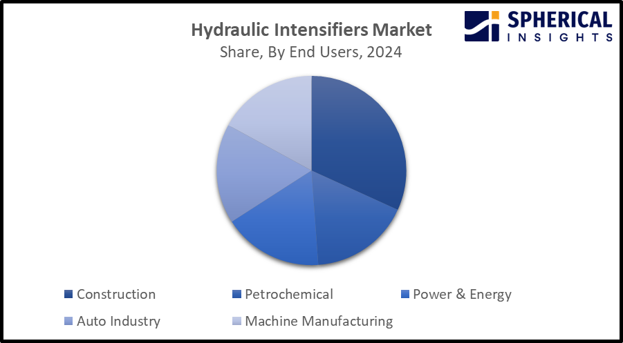 Based on the end users, the hydraulic intensifiers market is divided into construction, petrochemical, power & energy, auto industry, and machine manufacturing. Among these, the construction segment accounted for the largest share of about 28% in 2024 and is anticipated to grow at a significant CAGR during the forecast period. Hydraulic intensifiers are used in high-flow applications in construction. It is used where a robust hydraulic jack is required, but space constraints limit the cylinder size that would typically be necessary to generate the desired lifting force at the available system pressure. Development of smart construction technologies and the widespread use of automated machines are driving the market demand in the construction segment, especially in large-scale infrastructural and city projects.