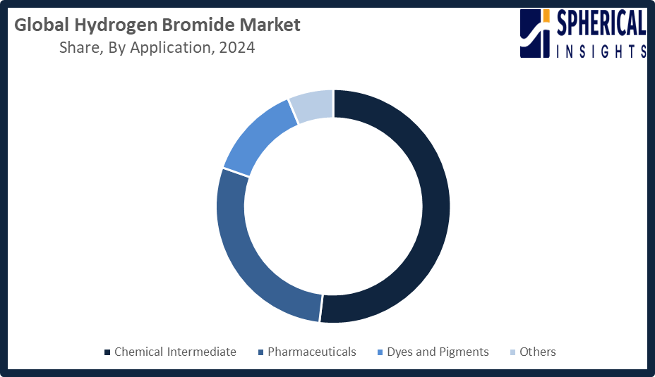 Based on the application, the hydrogen bromide market is divided into chemical intermediate, pharmaceuticals, dyes and pigments, and others. Among these, the chemical intermediate segment accounted for the largest share in 2024 and is anticipated to grow at a significant CAGR during the forecast period. The chemical intermediate segment had the largest share of the market due to the prominent use of HBr in the manufacturing of pharmaceuticals, agrochemicals, and speciality chemicals. Its utility value in halogenation reactions and organic reactions contributes to the rising demand in the manufacturing of various chemicals. This will increase the dominance of the segment within the HBr market.