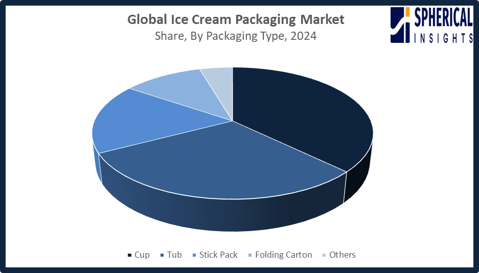 Based on the material, the ice cream packaging market is divided into plastic, paper & paperboard, glass and others. Among these, the plastic segment accounted for the largest share in 2024 and is anticipated to grow at a significant CAGR during the forecast period. Plastic continues to be the material for ice cream packaging owing to its strength, low weight, cost-effectiveness and effective insulation. Commonly utilized for tubs and bags, plastics such as PET, HDPE and PP provide barrier properties that help avoid freezer burn. Their adaptability allows for containers, resealable caps and user-friendly designs, improving convenience and attractiveness, for both consumers and manufacturers.
