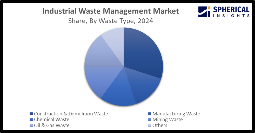 In the industrial waste management market, the construction & demolition waste segment holds the largest share of around 30.1% in 2024, owing to urban infrastructural needs and the emergence of technologies like AI-powered sorting systems and decision support tools. Construction and Demolition (C&D) refers to debris and materials generated from building, renovating, repairing, or dismantling structures like homes, roads, and bridges. It includes heavy components such as concrete, wood, metals, glass, and asphalt. Additionally, waste from the manufacturing industry is anticipated to grow due to the growth of industrialisation in the developing nations, resulting in excess scrap, which may cause air and water pollution. 5% of manufacturing-related waste was discharged into the environment in 2019. The remainder, however, has been addressed by recycling, treatment, and other methods.